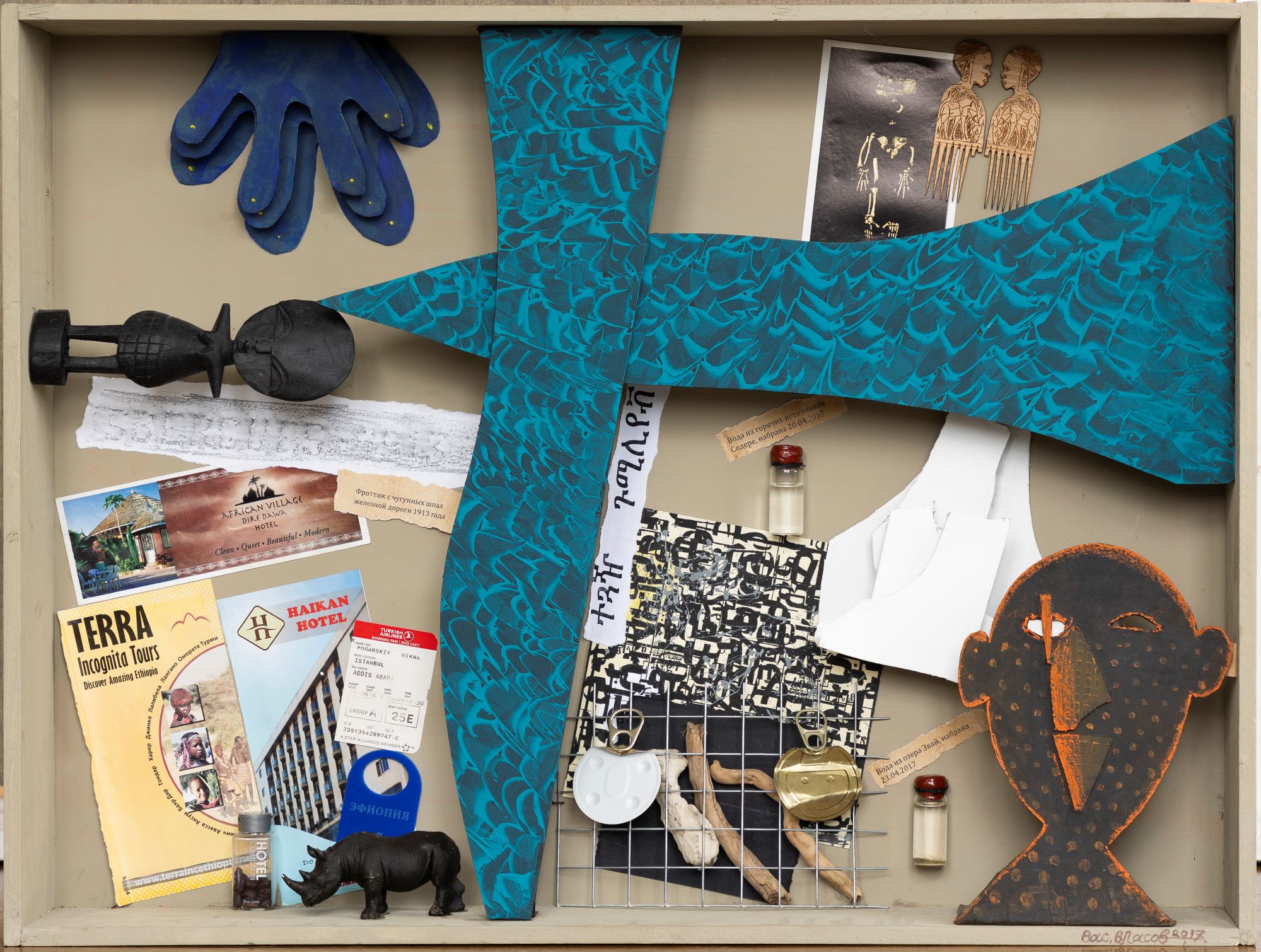 Первый выставочный зал нашей выставки «Сны об Африке» выстроен как интродукция в тему, которая в художественной форме осмысляет и перерабатывает реальные впечатления, чувства, зарисовки Василия Власова в период арт-путешествия 2017 года в Эфиопию «По следам Гумилева». Линией ярких фигуративных образов становится серия работ «Африканский дневник»: образы ослика, гиены, сидящих на улице за завтраком временных поселенцев, впечатления от литургических танцев священников. Серия работ «Доски странствий» — это вместилище памятных артефактов, среди которых находятся не только воспоминания о музейных экспонатах кукол Акуа-ба Ашанти (Гана), масок из Танзании народов Маконде или масок народов Боа из ДР Конго, но и эскизные зарисовки автора, и засушенные листья местных деревьев, и вода из озер и рек, и туристические проспекты, и корешки авиабилетов, и крышки консервов…Использовав традиционный принцип классических естественнонаучных музеев Европы, Василий Власов создает очень современные по содержанию ассамбляжи — объекты в которых можно долго рассматривать и долго удивляться их разнообразию. В недавнем интервью автор признался, что те головы-маски с закрытым ртом и мифологический образ летящей птицы в работе «Доски странствий» 4 — ни что иное как чистая фантазия автора, никак не связанная с мифами или с ковидом. Так получилось.